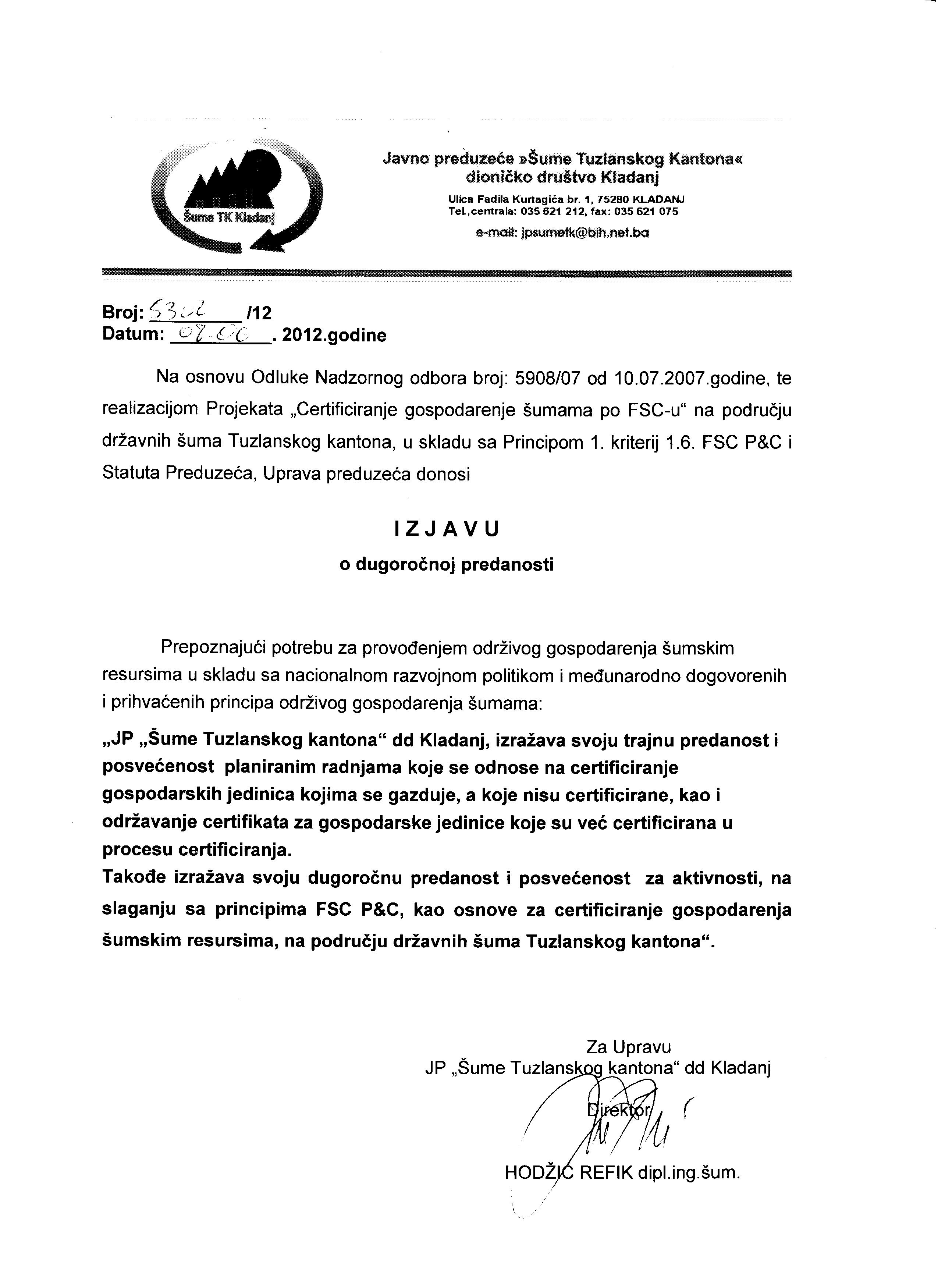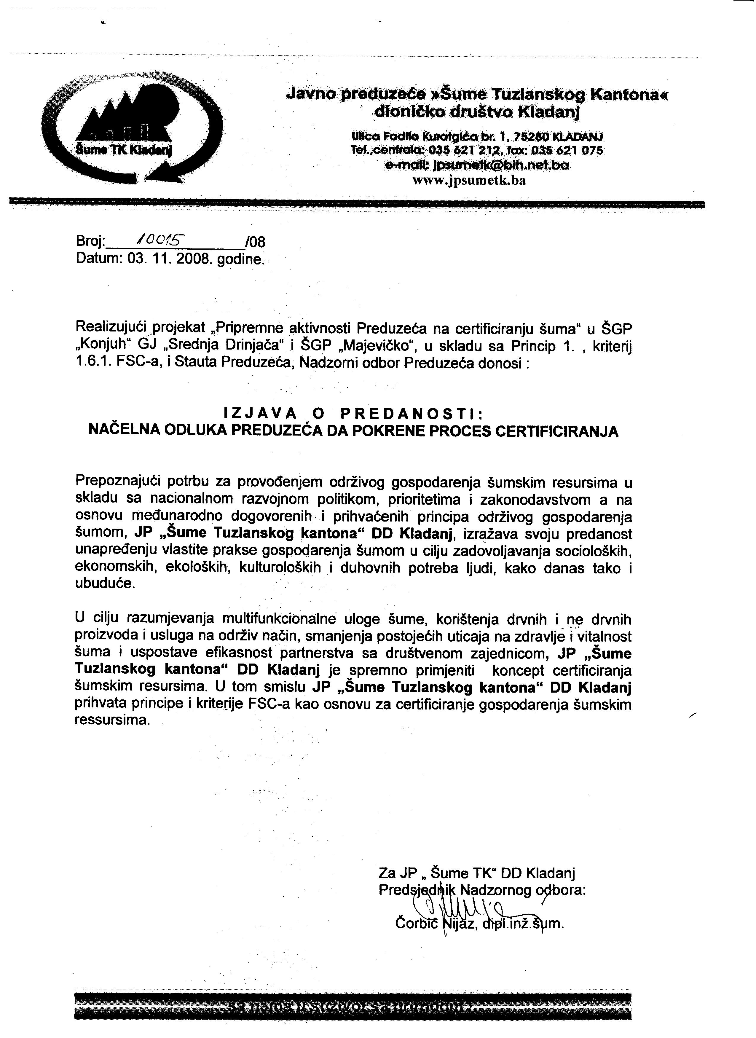 I ovaj audit kao i svi predhodni, potvruđuje opredjeljenost preduzeća odnosno menadžmenta preduzeća za ovaj novi koncept gospodarenja sa šumama, na principima kontinuiteta potrajnosti gospodarenja sa šumama u cilju očuvanja polivalentnih funkcija šuma, ekoloških, socioloških i ekonomskih.