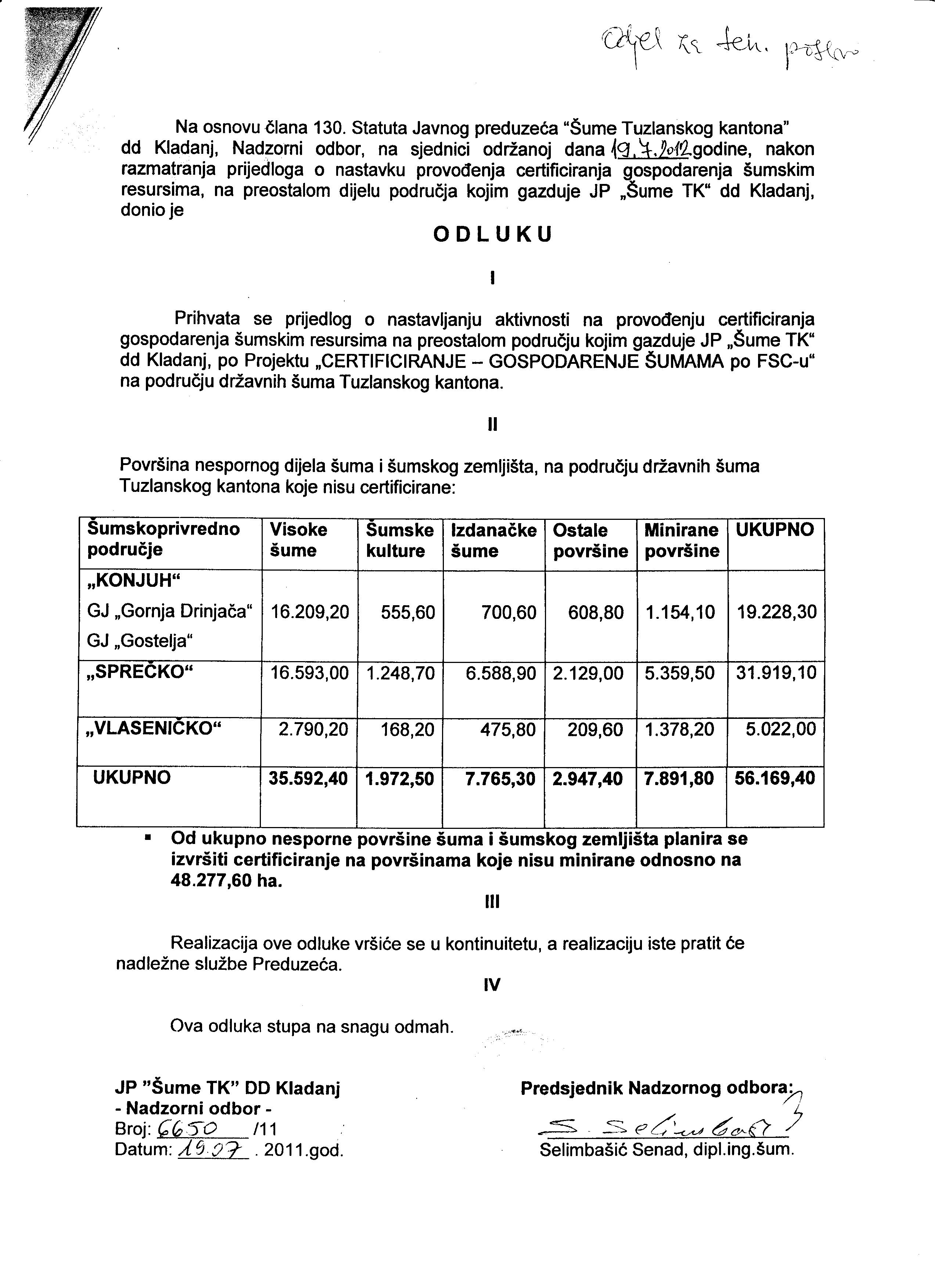FSC Certifikat je odgovor menađmenta i preduzeća kao korisnika šuma da su obaveze iz uzgajanja, zaštite i korištenja šuma a koje proizilaze iz Zakona o šumama i drugih propisa ispunjene.